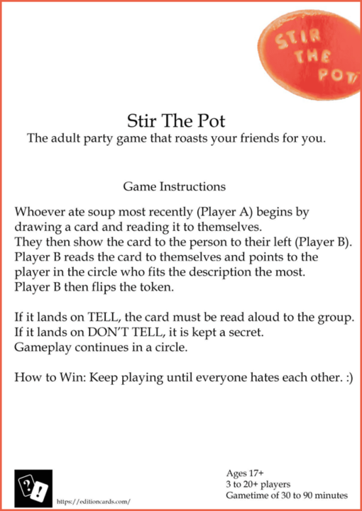 . Pro tip: If you say "no offense" before the game starts, nothing you say after can be held against you! Answer the question, then flip the token, and depending on what the token. Stir The Pot is one of the simplest games to play, however, we thought of sharing a rules page as well, so that everything is as clear as possible